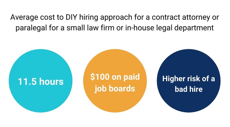 On average, from surveying our own small law firm client and legal department clients, they spend ~11.5 hours and $125 on paid job boards per contract attorney or paralegal role when they run their own hiring process. Time spent hiring at large organizations varies widely and often takes longer due to how much process, bureaucracy, and people are involved in the process.