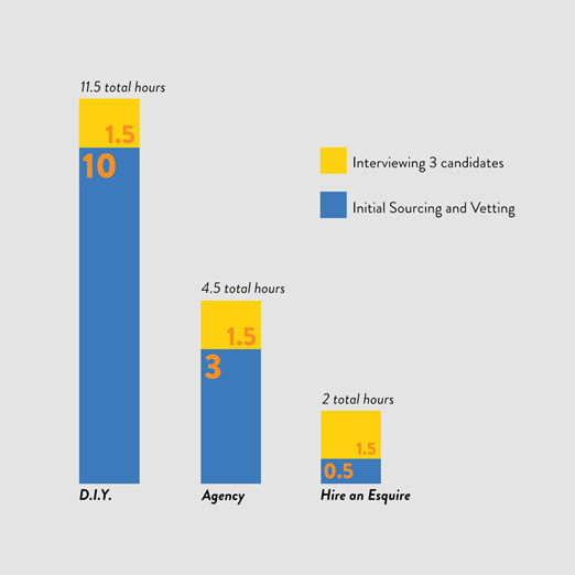 Here are the average time and costs to consider when sourcing and vetting an attorney based on whether you choose a DIY, traditional agency, or Hire an Esquire approach to hiring contract attorneys or paralegals.