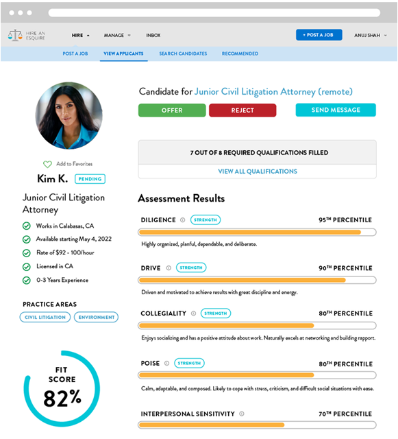 The data and research behind our candidate recommendations and matches can also help you save on the cost of a bad hire. When you receive applicants on Hire an Esquire, you will see their experience with each qualification required for your role and the soft-skills as determined by years of legal industry and general industrial-organizational psychology research to be the most important to your job and work environment. In addition to having research-backed data to predict a candidate’s success, this can make the process of hiring simpler and faster by taking some of the guesswork out of whom to interview and whom to hire. You can read more about how lawyer soft skills predict performance here.