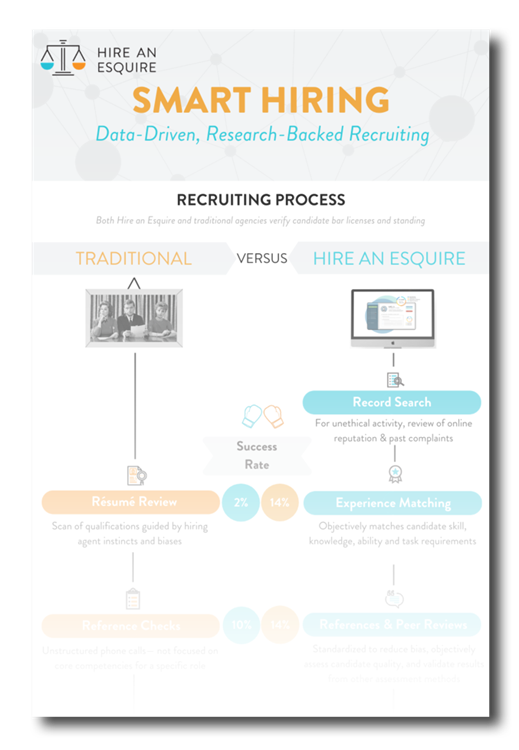 Hire an Esquire flexes to your needs. For a flat subscription, at Hire an Esquire, we provide many of the services of a legal staffing agency. For the full legal staffing agency experience, we offer payroll services. Our subscription service provides vetting and verification of credentials, whereas our payroll manages taxes, withholding, and other compliance-related matters. Additionally, at Hire an Esquire, we have married science and technology for a more efficient and precise staffing experience. This saves on 1) the time invested in contingent hiring, 2) the risk of a bad hire by providing better insight into how a candidate will perform, and 3) agency fees, thanks to the efficiencies of technology and our business processes.