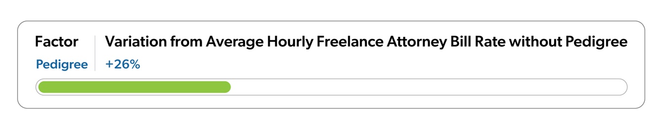 One of the top factors impacting the hourly rate for freelance lawyers was pedigree. We defined attorneys as having pedigree if they 1) attended a top 15 law school and/or 2) had worked at an AmLaw 200 firm as an associate. Having this background commanded the most significant change in hourly rates for freelance lawyers if experience was equal and the attorney did not have a dual professional license or STEM background (see below).